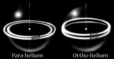 PAIRS OF ELECTRONS; HELIUM AND HYDROGEN Snelson represents the two different electronic states of Helium as different magnetic relationships for the electron orbits.
