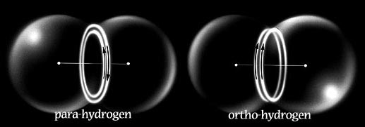 In a similar manner, Snelson represents two structures for the Hydrogen Molecule. This bears resemblance to Bohr's original model with two protons sharing a pair of electrons, in orbit between them. In Snelson's picture, the two electrons occupy exclusive orbits which associate magnetically either in parallel (ortho-Hydrogen), or in antiparallel (para-Hydrogen).